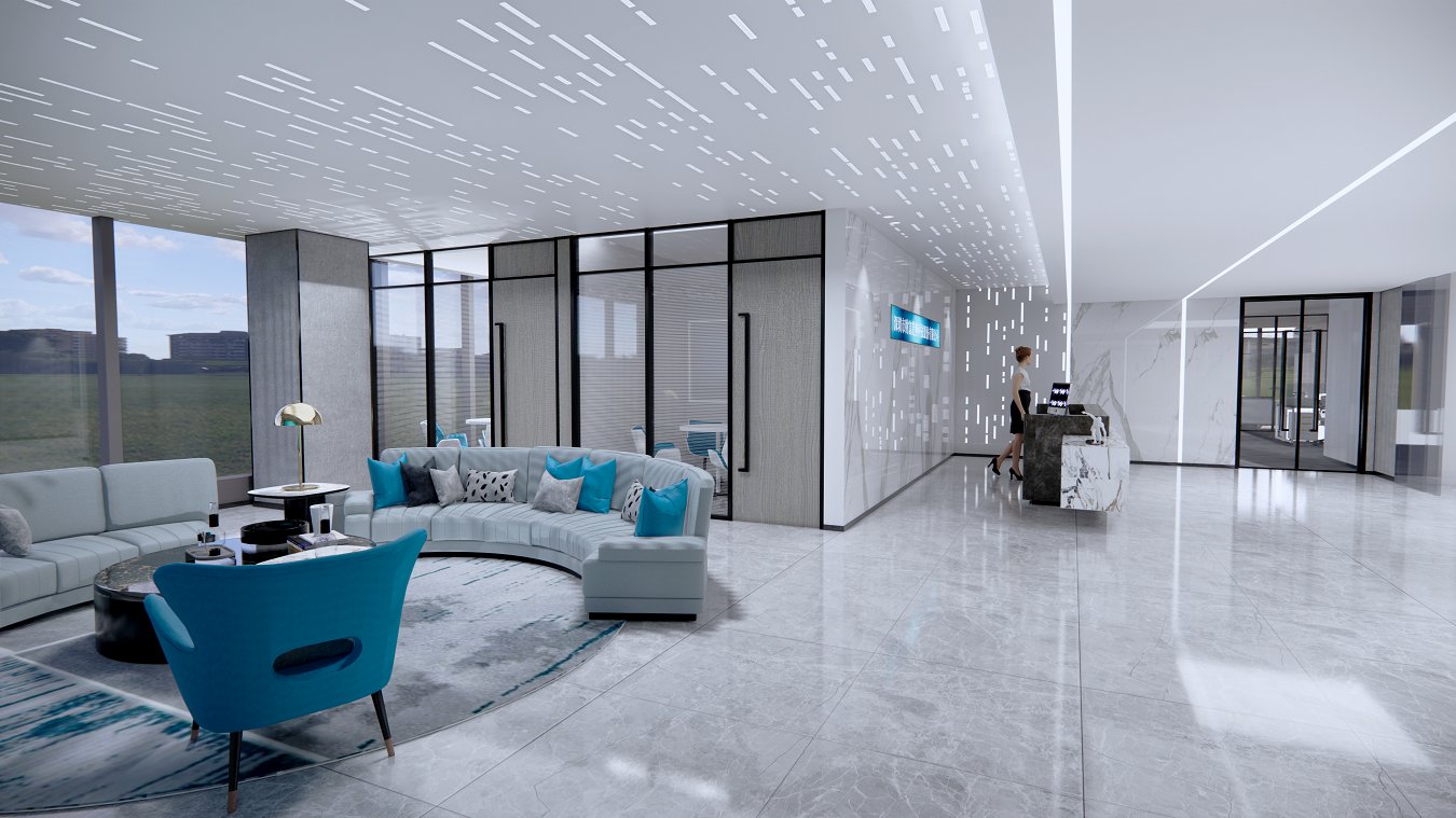 设计说明:本方案的业态为金融科技公司,通过与甲方的多次沟通,把设计风格定位在轻奢的基础上体现科技感,以体现公司在行业中领先的地位。地面选用浅咖灰色系仿大理石地砖,以此呈现轻奢格调,也贴合公司企业意欲呈现的高端调性。背景选材白色大理石纹路岩板以呼应地面的整体感官,极简的顶面来平衡空间的关系,采用线性光源满足照明需求,灯带流线犹如股票市场上一根根浮动的K线,深扣主题,传达出冲击,动态的视觉体验。